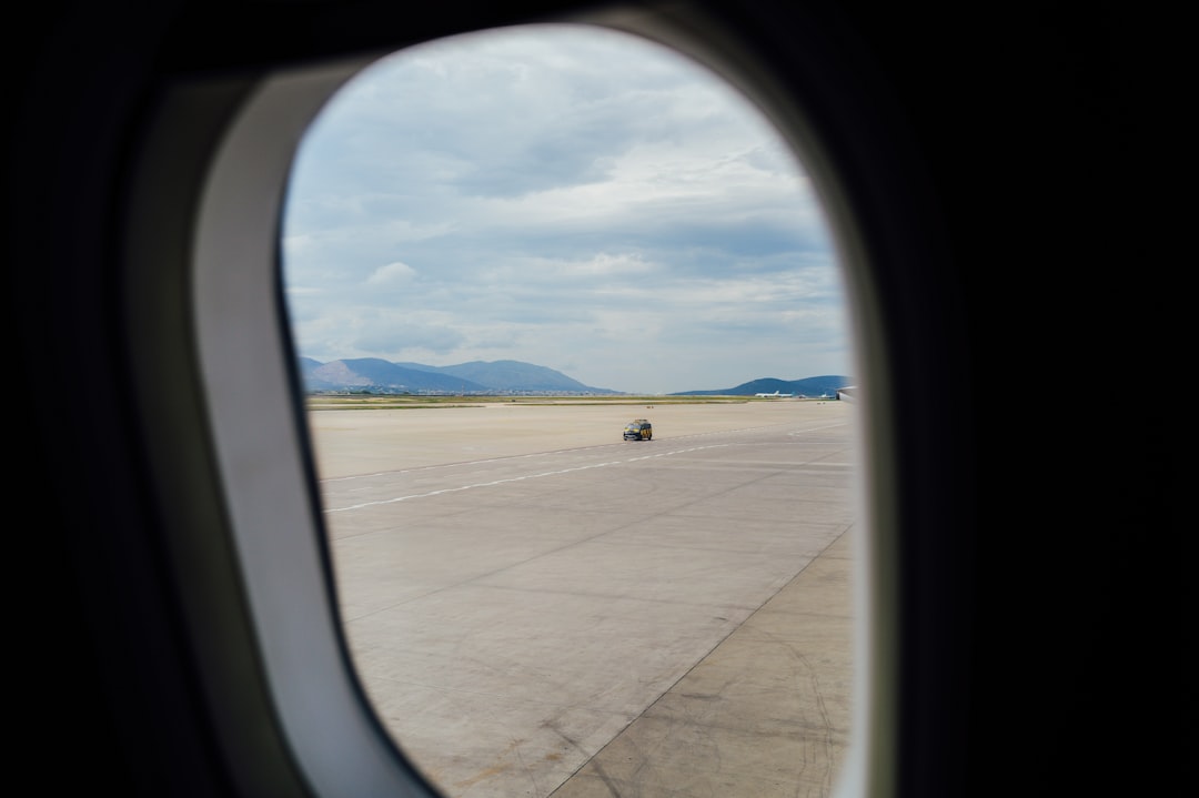 Fenêtre d'avion donnant sur le tarmac pendant une escale