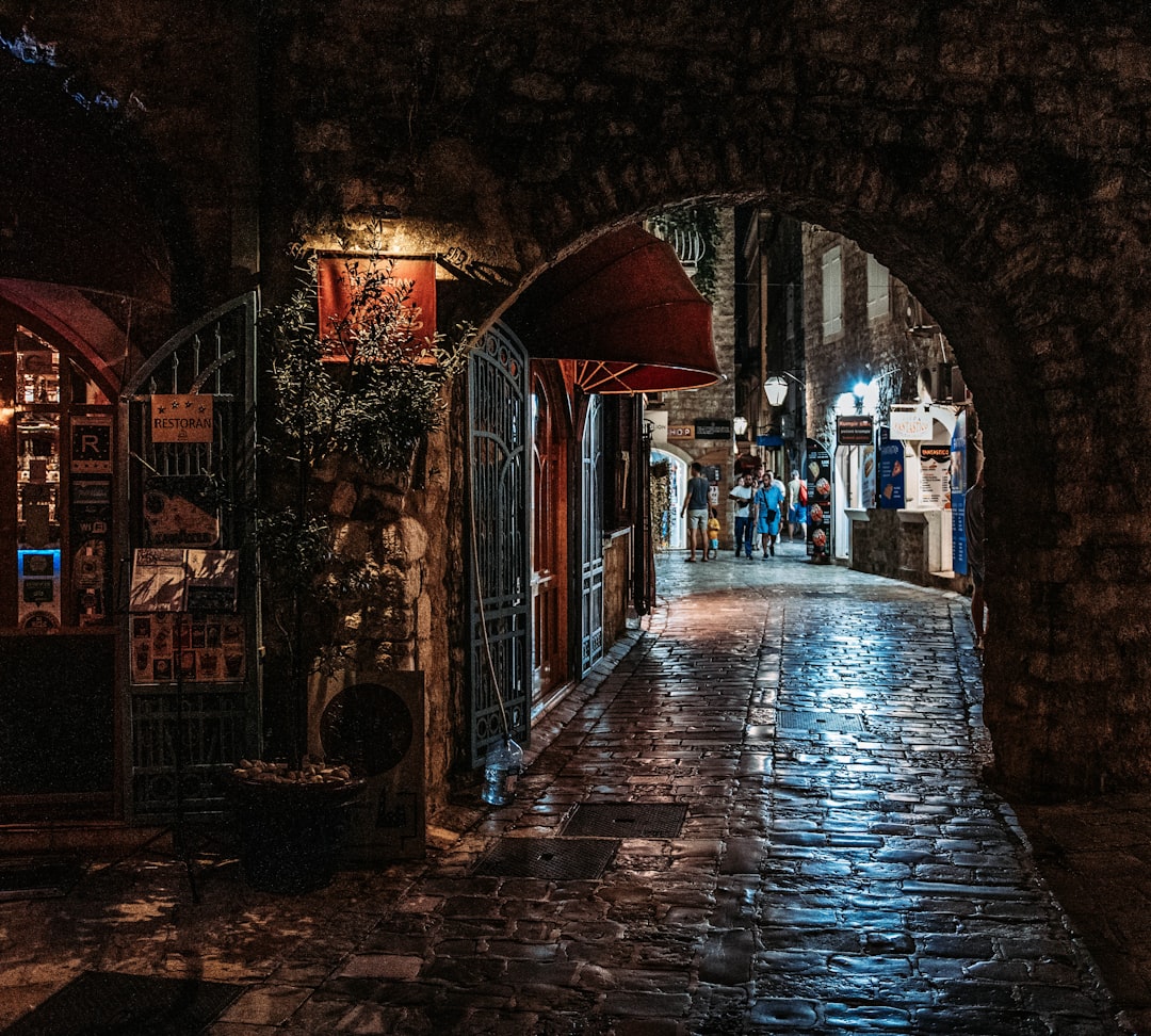 Rue piétonne de centre-ville avec façades anciennes en soirée